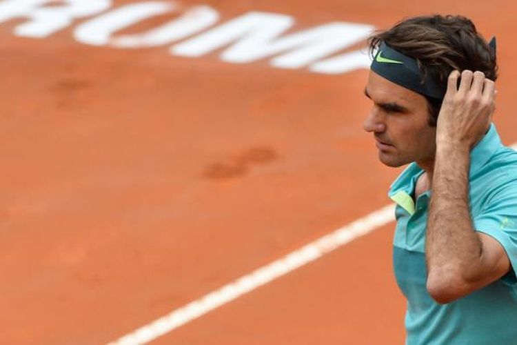 Petenis Swiss, Roger Federer, bereaksi saat menghadapi petenis Ceko, Tomas Berdych, pada babak perempat final Italia Terbuak di Roma, Jumat (15/5/2015). Federer menang 6-3, 6-3.