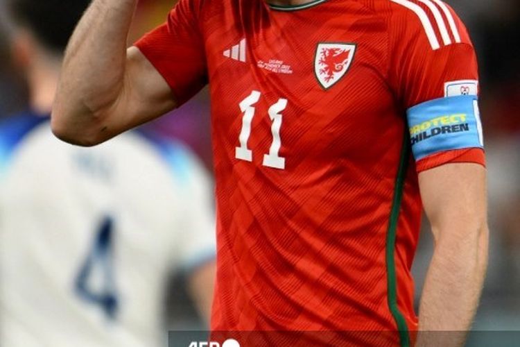 Kapten Wales Gareth Bale dalam laga matchday 3 Grup B Piala Dunia 2022 melawan Inggris di Stadion Ahmad bin Ali, Al Rayyan, Qatar, Rabu (30/11/2022) dini hari WIB. Wales kalah 0-3 dari Inggris dan tersingkir dari Piala Dunia 2022. Bale kecewa sampai menampar kamera kru TV selepas pertandingan.(AFP/NICOLAS TUCAT)