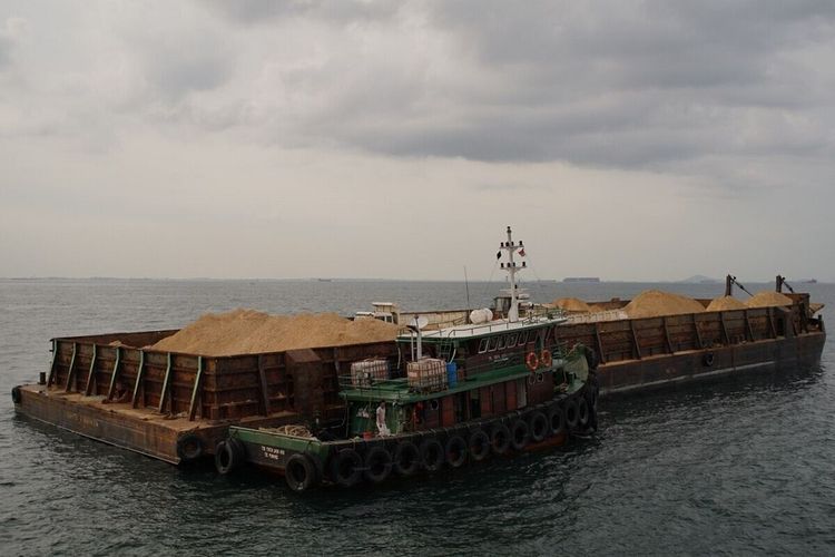 Sebuah kapal tunda dan kapal tongkang pengangkut pasir dari Pulau Citlim, Kecamatan Moro, Kabupaten Karimun, Kepulauan Riau, disita Gugus Keamanan Laut Komando Armada I untuk selanjutnya dibawa ke Pangkalan TNI AL di Batam, Kepulauan Riau, Kamis (25/7/2019)(KOMPAS/PANDU WIYOGA)