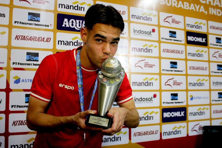 Penyerang Timnas U19 Indonesia, Jens Raven, mencium piala saat menjuarai Piala AFF U19.